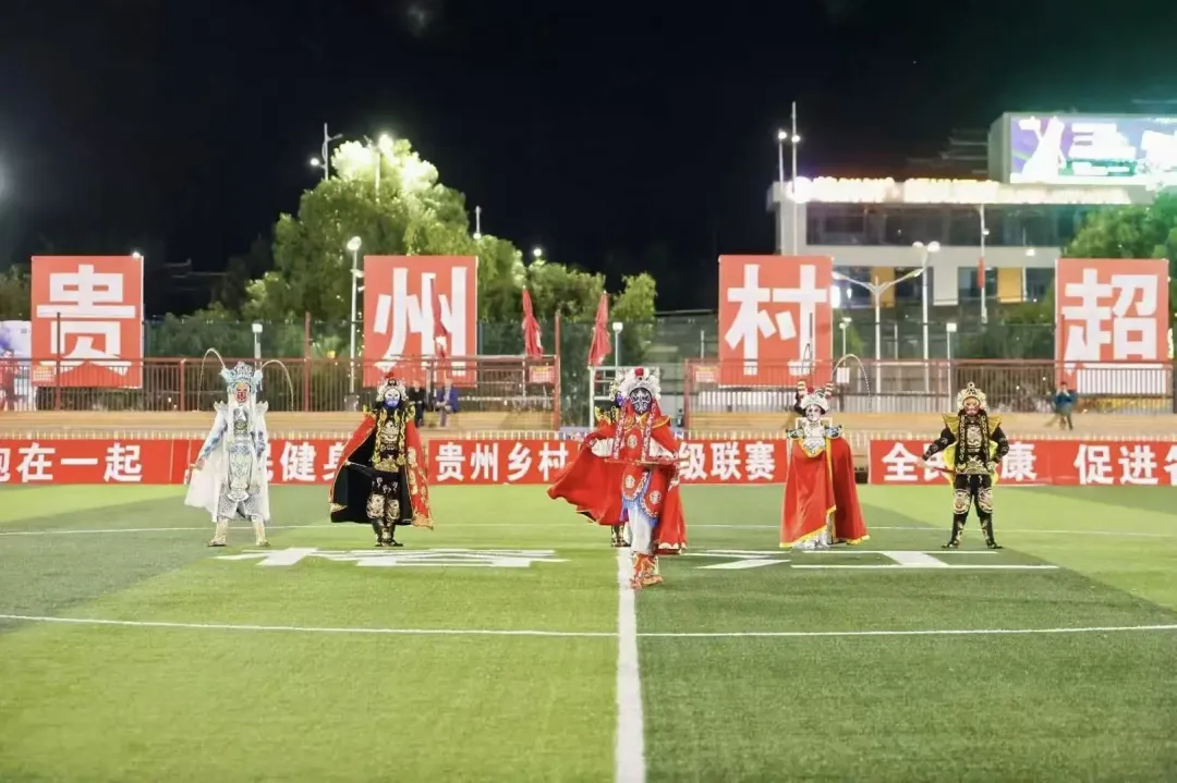 19日晚的“村超”友谊赛中场休息时,由"亮公益"协调四川艺术职业学院带来的川剧变脸表演惊艳全场。演员们身着传统戏服,在激昂鼓点中变换九张脸谱,其中包括特别设计的"大熊猫"脸谱,向榕江观众传递四川文化符号。